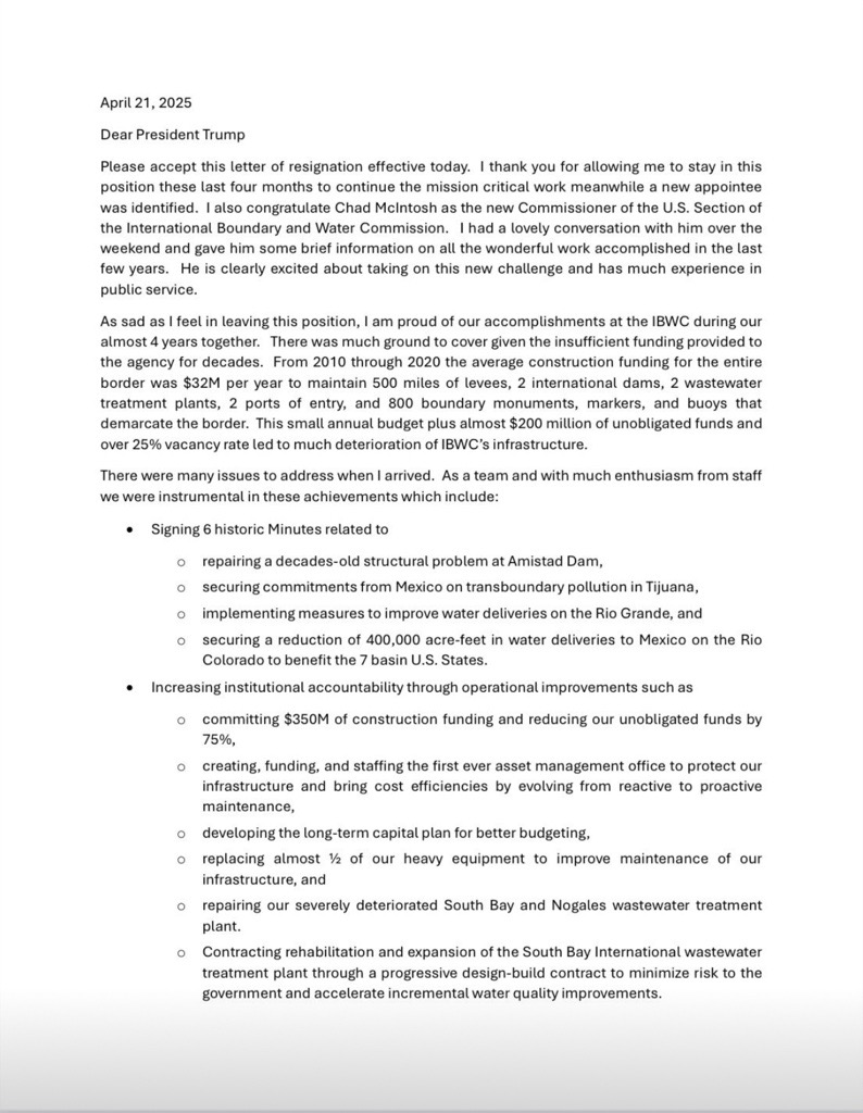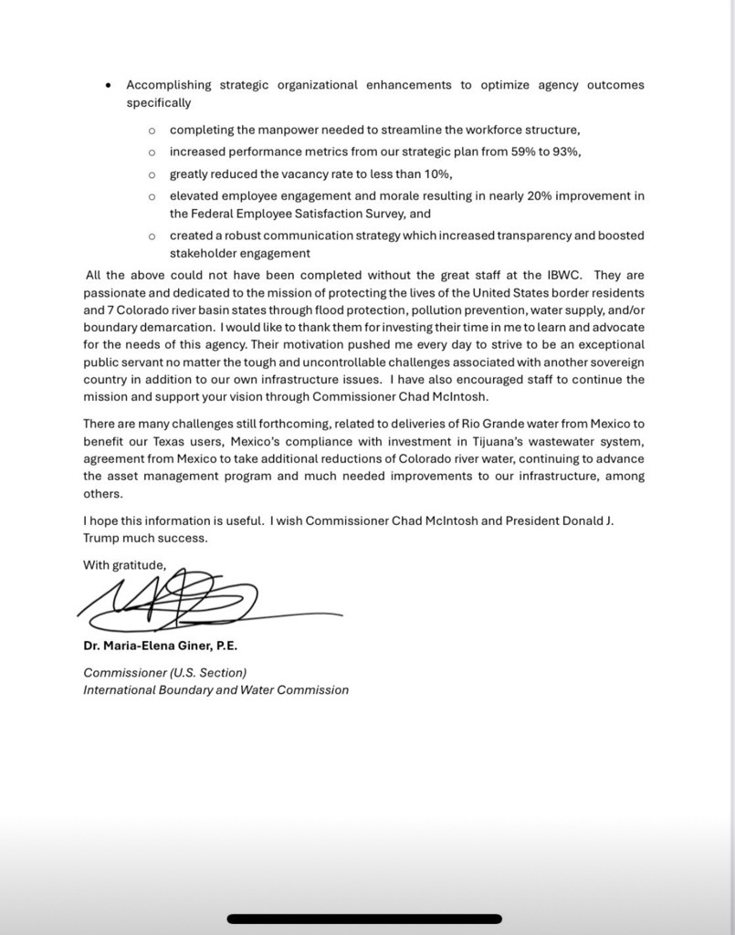 April 2025—Maria-Elena Giner, the U.S. Commissioner of the International Boundary and Water Commission (IBWC), has officially resigned following pressure from the Trump administration.