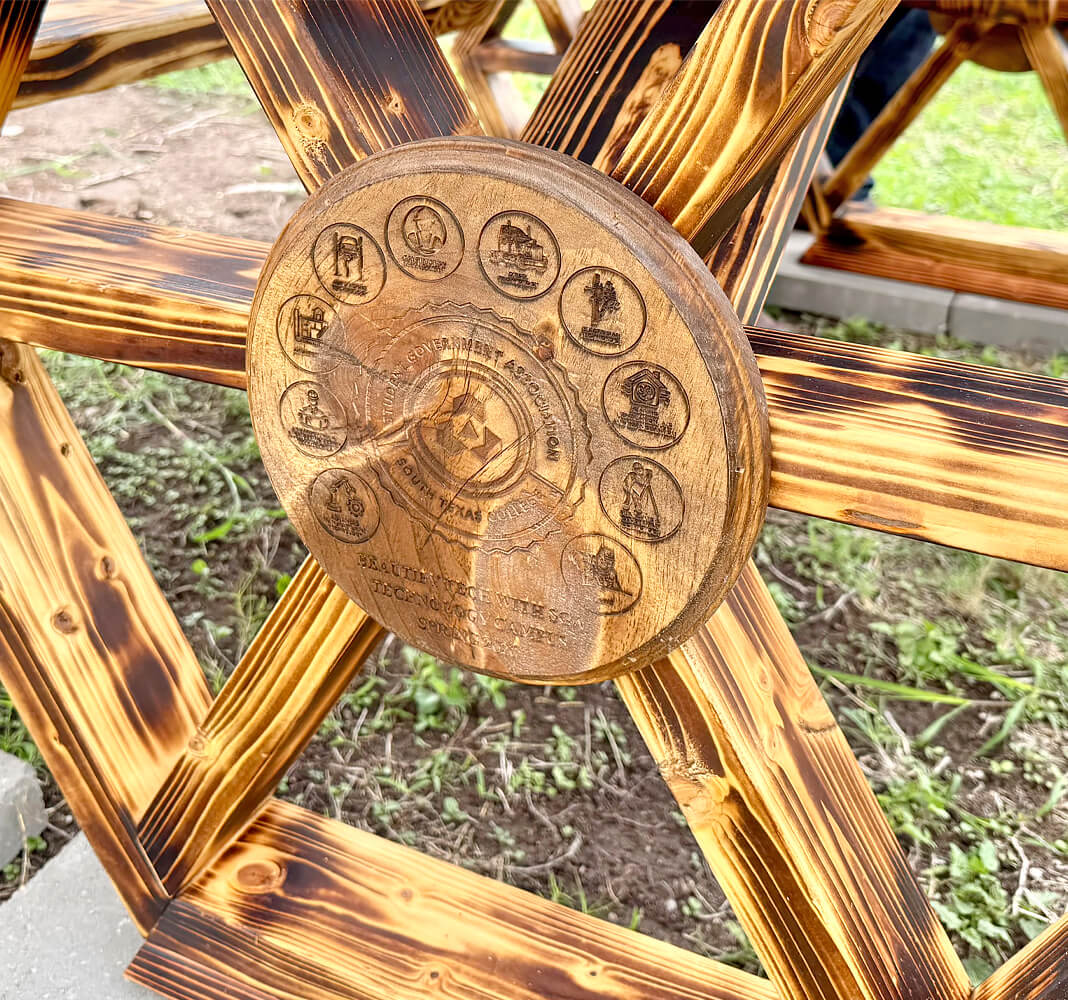 Each table features custom engravings representing the various programs offered at the Technology Campus, which serves both as functional seating and a tribute to the campus community.
