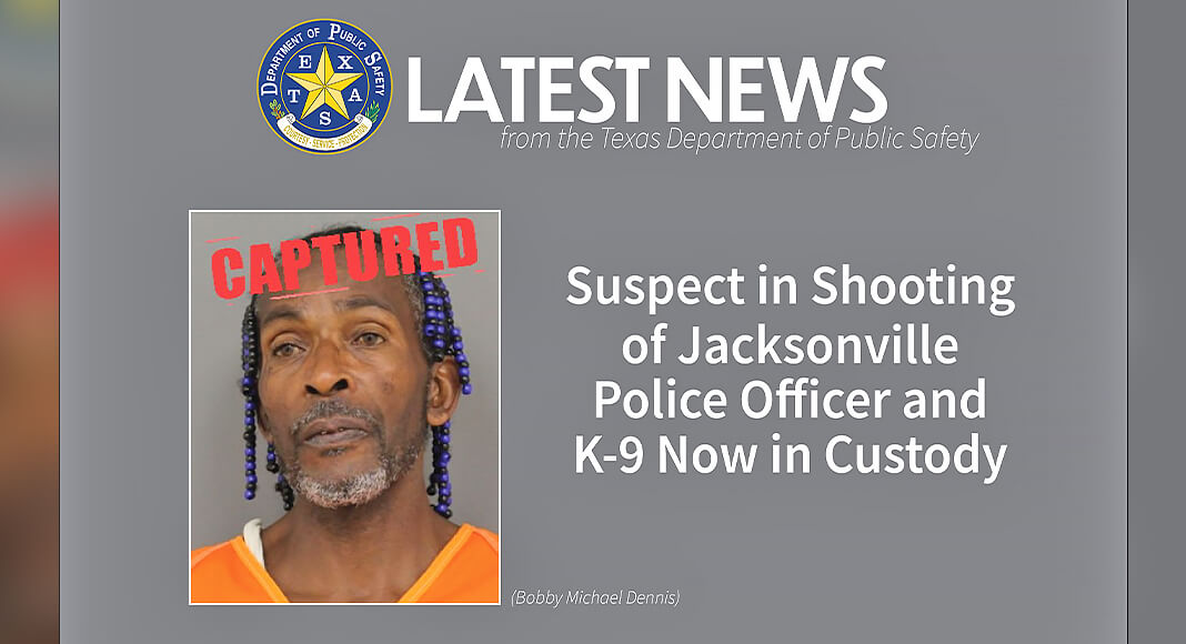 AUSTIN – The Texas Department of Public Safety (DPS) announces the capture of Bobby Michael Dennis – the man wanted in the shooting of a Jacksonville Police Officer and her K-9, and subject of last week’s Blue Alert. The Officer and K-9 were both injured in the shooting and are now recovering. Dennis was arrested on November 5. A Texas Crime Stoppers reward will not be paid for his capture.