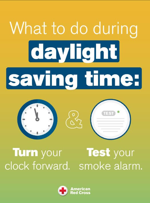 SMOKE ALARMS When turning your clocks forward this weekend, test your smoke alarms and replace the batteries if needed.Visit redcross.org/fire for more information, including an escape plan to create and practice with your family, or download the free Red Cross Emergency app by searching “American Red Cross” in app stores.