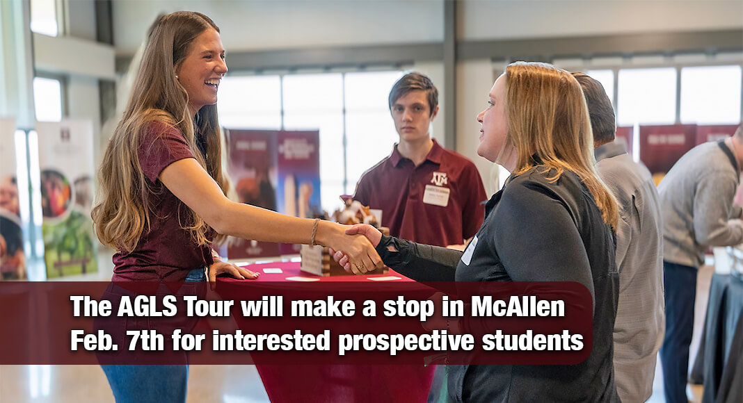 The Texas A&M College of Agriculture and Life Sciences will host a series of student receptions across Texas beginning Jan. 21 as part of its annual AGLS on Tour program, bringing the College directly to prospective and admitted students and their families. The AGLS tour will make a stop in McAllen Feb. 7 from 2-4 p.m. at Texas A&M Higher Education Center at McAllen.