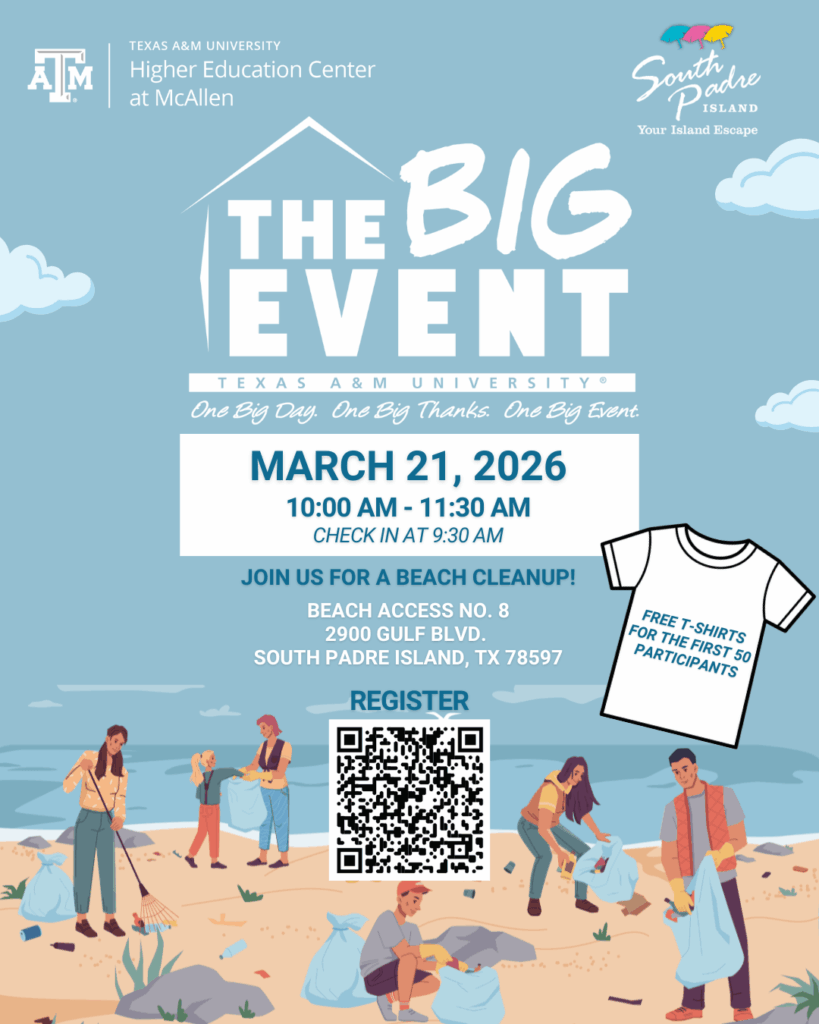 McALLEN, Texas – The Texas A&M University Higher Education Center at McAllen (HECM) is partnering with Visit South Padre Island to invite students, former students and community members to The Big Event, the largest one-day, student-run community service project in the nation, for a beach cleanup on Saturday, March 21, 2026, from 10 a.m. to 11:30 a.m.