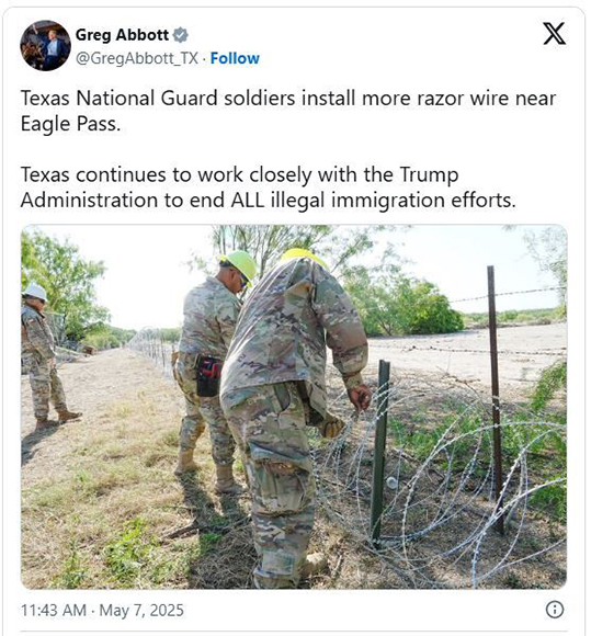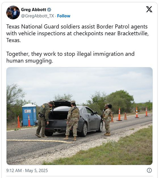 On Monday, Governor Abbott showcased on X the critical work that Texas National Guard soldiers are doing alongside Border Patrol agents to secure the border.