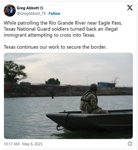 Earlier this week, Governor Abbott took to X to highlight Texas National Guard soldiers successfully turning back an illegal immigrant attempting to cross into Texas.