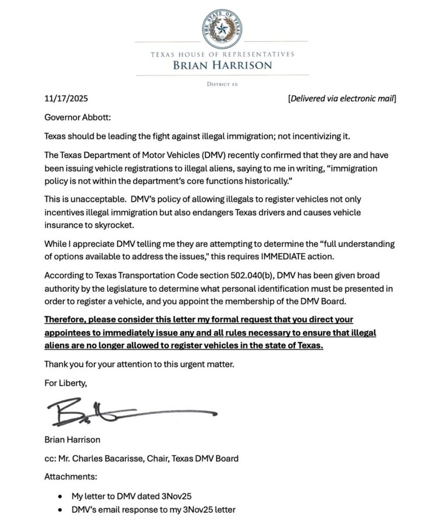 State Rep. Brian Harrison, R-Midlothian, has publicly called for stricter registration rules in recent weeks. Harrison said he had raised concerns to state officials and sent letters to the DMV and the governor’s office before the announcement. He also said he believes the change will reduce what he described as safety and insurance problems on Texas roads. See the letter below.