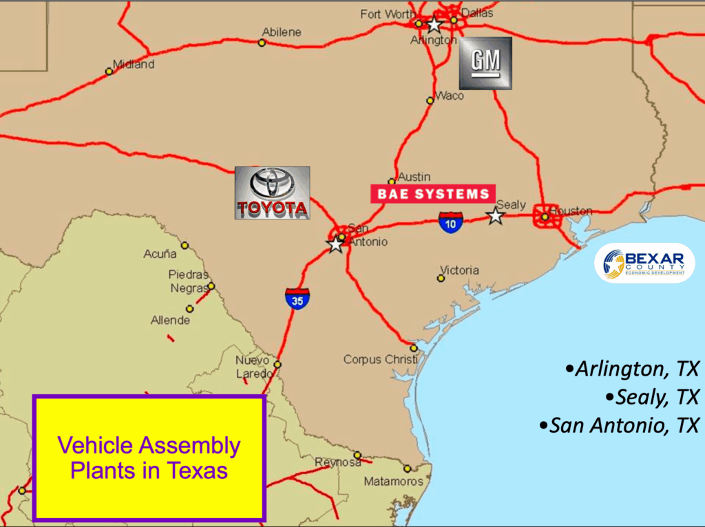 The Texas-Mexico Automotive Supercluster (TMASC) is a rapidly growing area that spans both Texas and northern Mexico. It’s a key part of the automotive industry, attracting major companies and investments to the region, and has a direct impact on Bexar County, especially San Antonio. The supercluster includes over 14 vehicle assembly plants and several major corporate headquarters, making it one of North America’s most important automotive hubs.