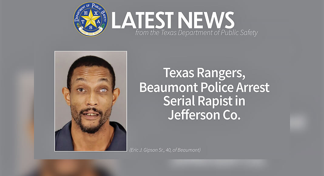 AUSTIN – The man responsible for raping at least four women between 2018 and 2024 is in custody following a joint investigation by the Texas Rangers and the Beaumont Police Department. Eric J. Gipson Sr., 40, of Beaumont, was indicted for his crimes by a Jefferson Co. jury on Aug. 20.