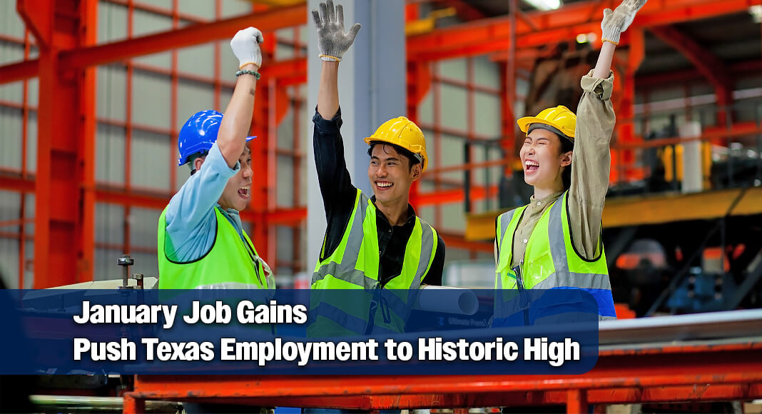 AUSTIN ‒ Governor Greg Abbott celebrated the strength and resilience of the Texas economy as the state gained 40,100 nonfarm jobs over the month of January and hit a new historic high of 14,379,500 total jobs.