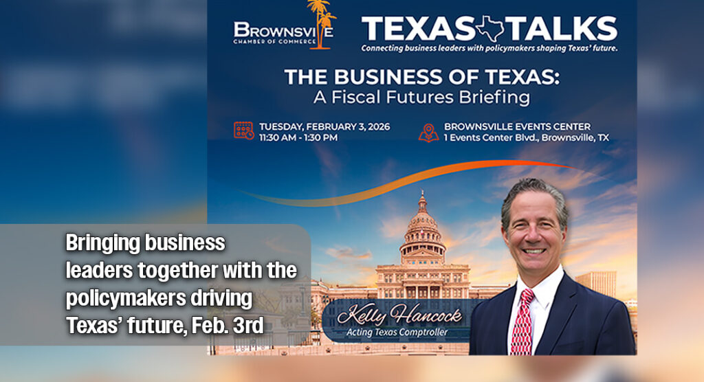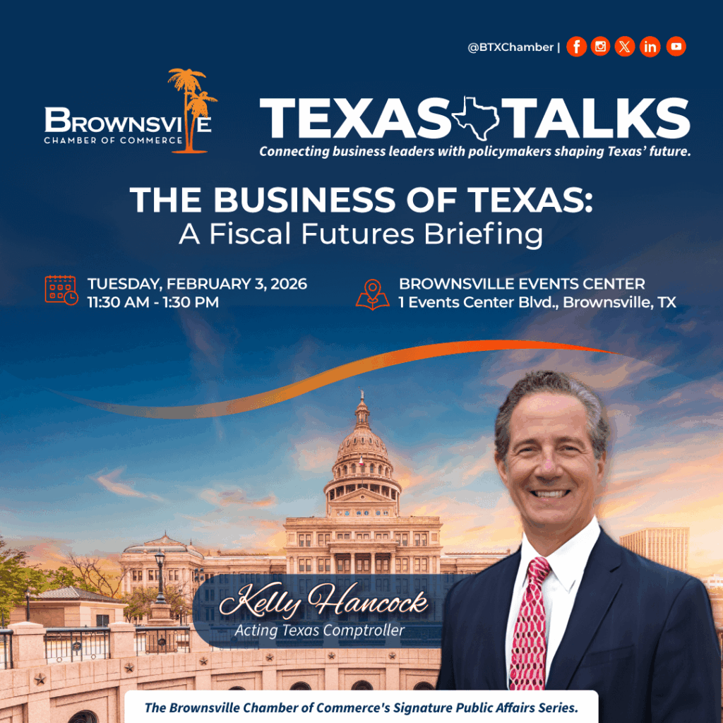 The Brownsville Chamber of Commerce proudly presents The Business of Texas: A Fiscal Futures Briefing with Acting Texas Comptroller Kelly Hancock on Tuesday, February 3, 2026, from 11:30 AM to 1:30 PM, at the Brownsville Events Center.
