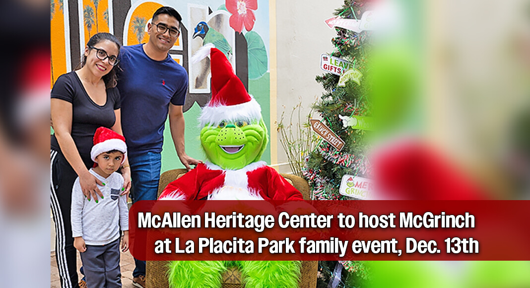The fifth annual McGrinch event, hosted by the McAllen Heritage Center (MHC)– Museum of History & Culture, will be held on Saturday, December 13, from 2pm to 6 pm. McGrinch at La Placita Park is a free event and will feature a meet-and-greet with our friendly McGrinch! Attendees are welcome to take cell phone photos with McGrinch! Local vendors and artisans, holiday music, food vendors, and pet adoptions via Palm Valley Animal Society. Spin the wheel for prizes including kids’ goody bags, McGrinch items, tees, and McAllenopolies, while they last, will make the event diverse, fun, and exciting!