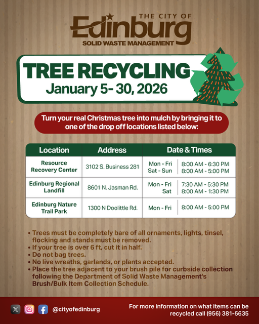 Edinburg, TX – As the holiday season winds down, the City of Edinburg invites residents to join in the environmentally friendly tradition of recycling Christmas trees. The Tree Recycling Program encourages residents to transform their festive evergreens into valuable mulch at designated drop-off locations.