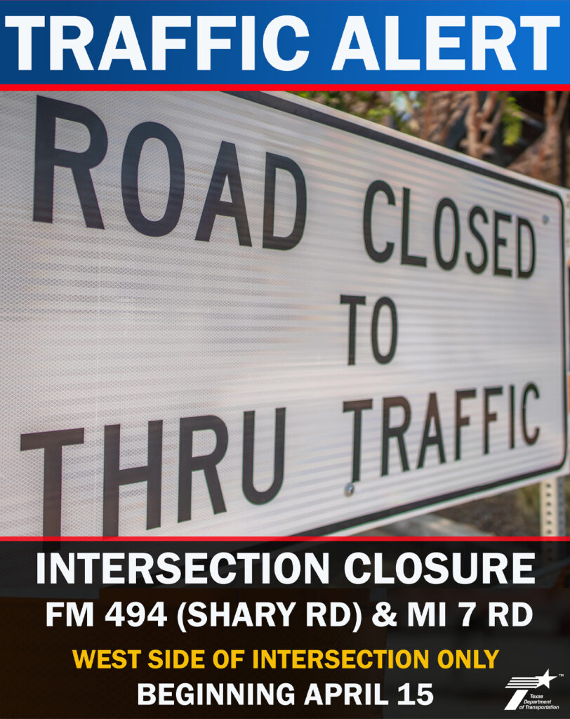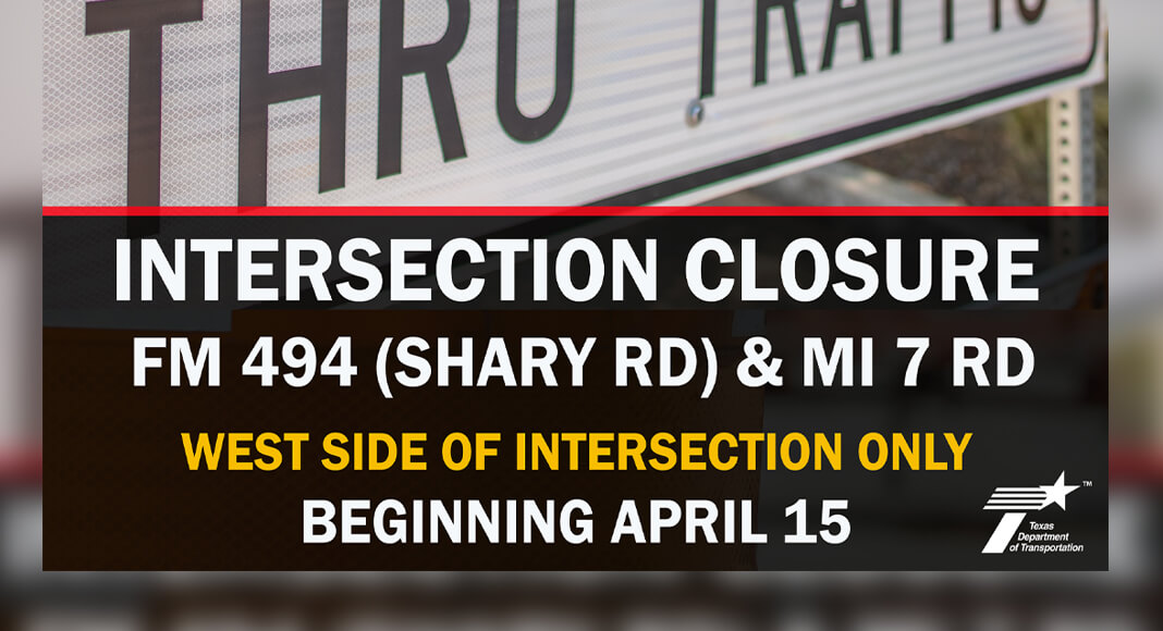 McALLEN – Road construction crews working on the FM 494 (Shary Road) widening project in McAllen plan to temporarily close the west side of the FM 494 (Shary Road)/Mile 7 Road intersection to through traffic, starting Wednesday, April 15.