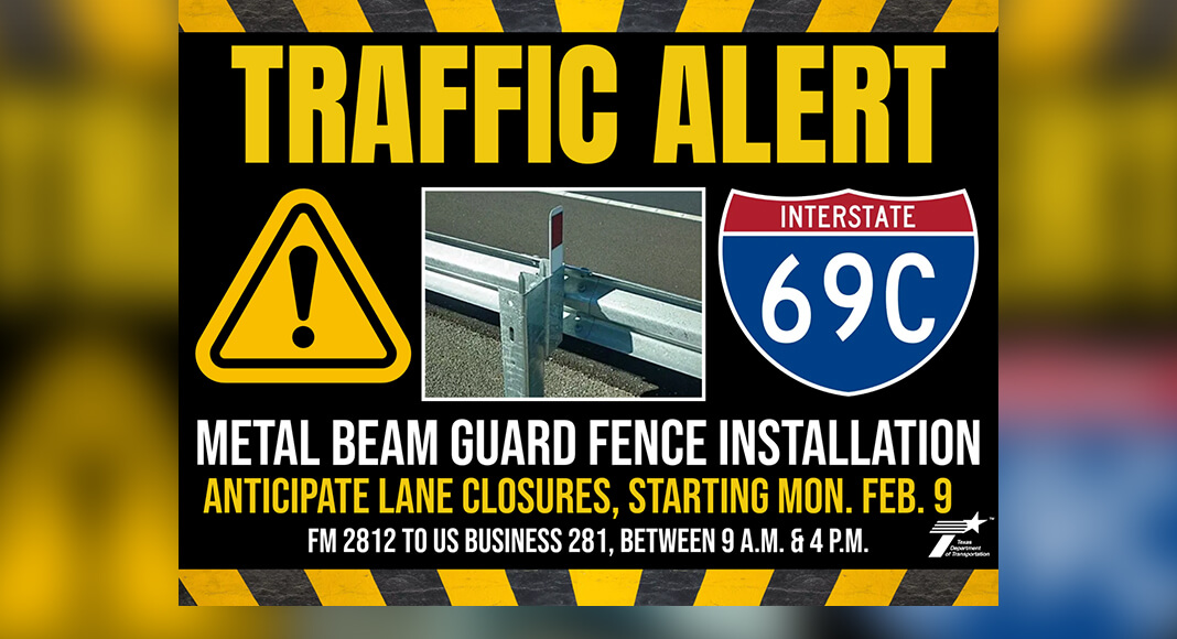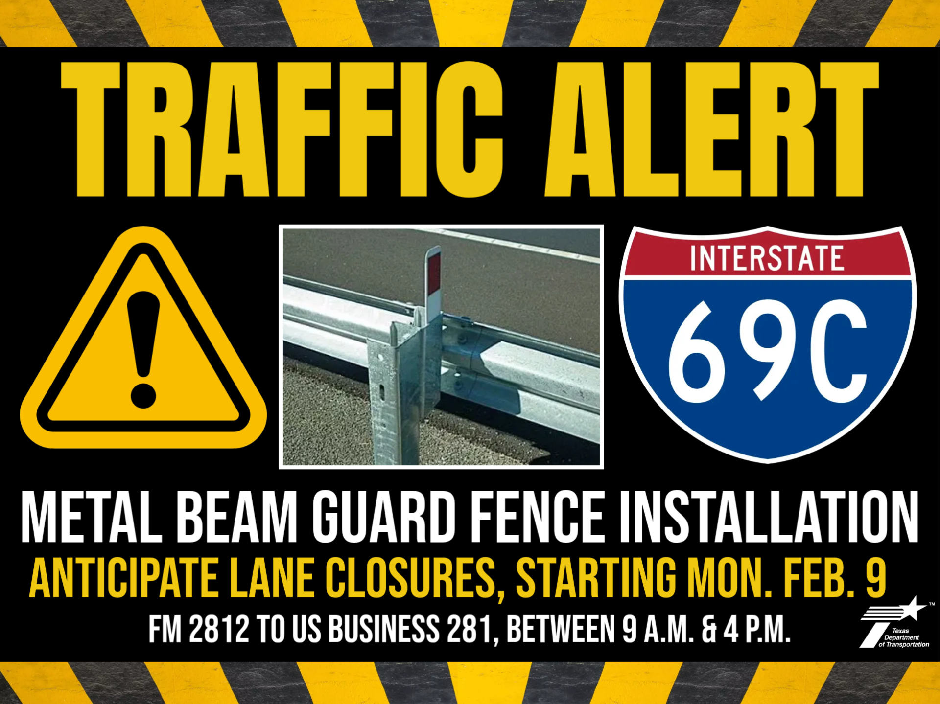 Crews will be installing metal beam guard fence to enhance safety on this segment of I-69C. Work is expected to be completed in approximately two weeks.