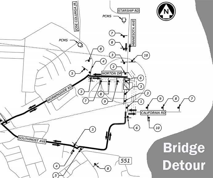 A guided two-mile detour route has been designated for drivers via Norton Drive, Morning Side Road, Southmost Avenue and California Road. (See Map)