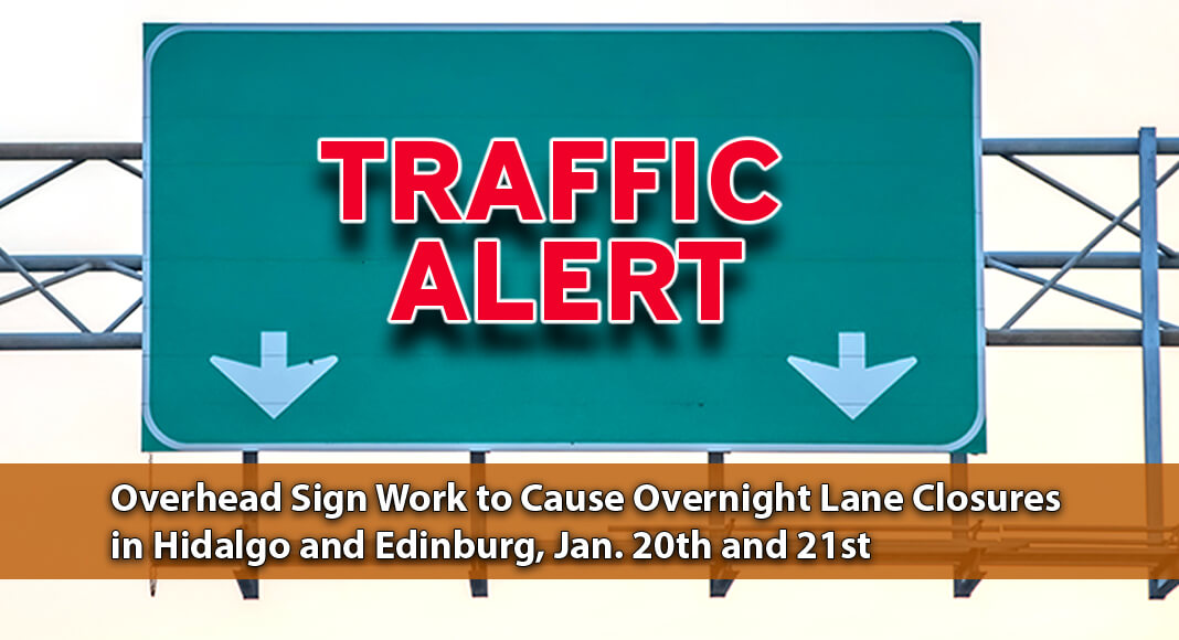 HIDALGO/EDINBURG – The replacement of large overhead signs on State Spur 115 (23rd Street) in the City of Hidalgo and I-69C (US 281) in Edinburg will require overnight lane closures, Tuesday, and Wednesday, respectively.