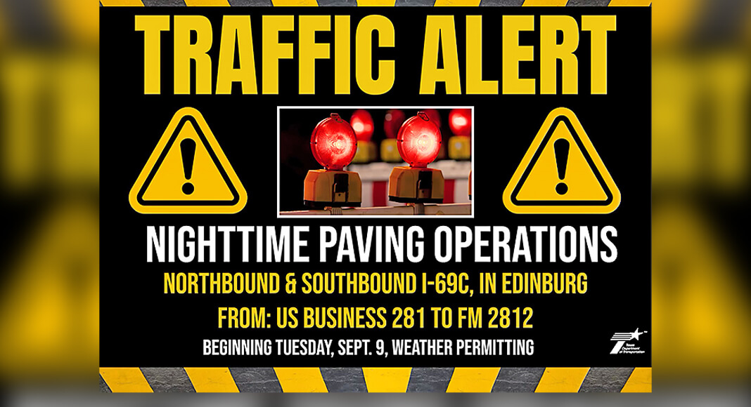 EDINBURG, Texas – Nighttime paving work is scheduled on northbound and southbound I-69C, between US Business Highway 281 and FM 2812 in Edinburg, starting Tuesday, September 9.
