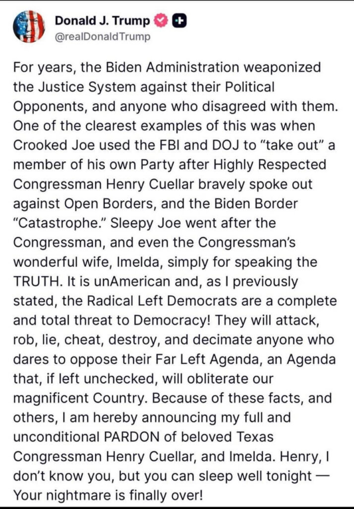 In a social-media post, Trump framed the pardon as a response to what he described as the “weaponization” of the justice system under the prior administration. He claimed Cuellar and his wife were targeted not for wrongdoing — but for dissenting on border and immigration policy.