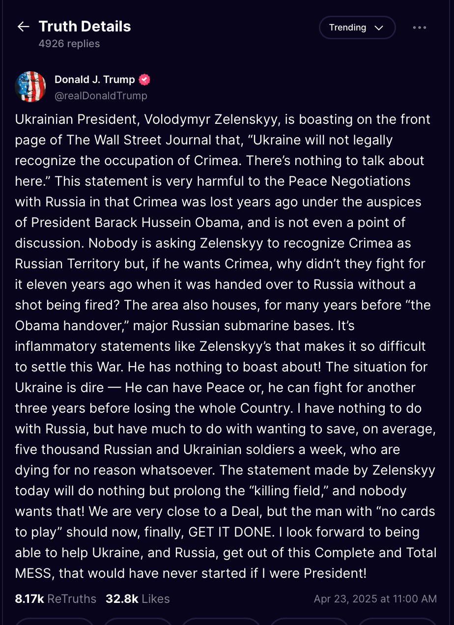 Zelenskyy, in a statement featured on the front page of The Wall Street Journal, declared that “Ukraine will not legally recognize the occupation of Crimea.” Trump reacted sharply, calling the comment harmful to peace negotiations and suggesting that Crimea, annexed by Russia in 2014, is no longer a matter for discussion. According to Trump, the territory was “lost years ago under the auspices of President Barack Hussein Obama,” and thus should not be a focal point in current talks.
