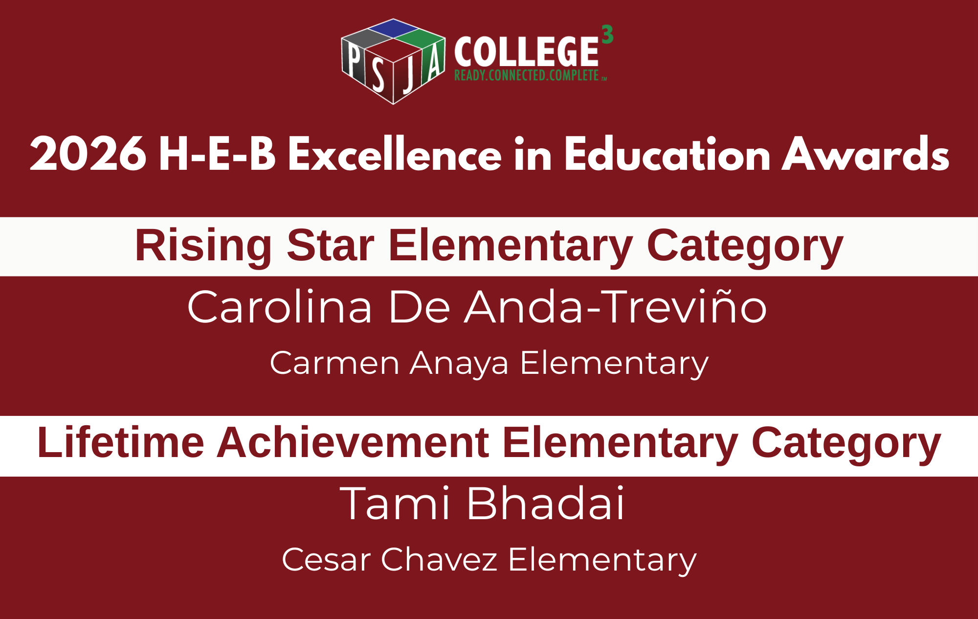 “We are honored to have two educators recognized as State Finalist for the H-E-B Excellence in Education Award,” said PSJA Superintendent Dr. Alejandro Elias. “This recognition reflects the dedication of our educators, staff, and school leaders who work tirelessly to serve our students. I am sincerely grateful to our PSJA Family and community partners for their trust, collaboration, and shared commitment to ensuring success for every child.”