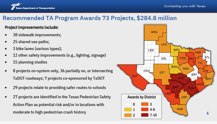 AUSTIN – The Texas Transportation Commission has approved more than $284.8 million for bicycle and pedestrian infrastructure that will help improve safety, mobility, access and quality of life for people across the state.