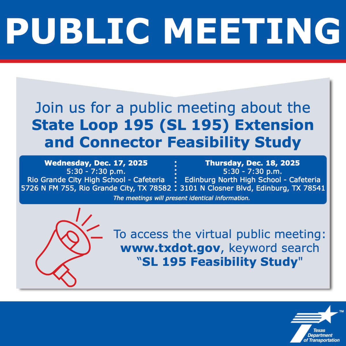 RIO GRANDE CITY & EDINBURG – The Texas Department of Transportation (TxDOT) Pharr District is conducting a feasibility study for the SL 195 Extension and Connector between the areas of Rio Grande City and Edinburg in Starr and Hidalgo Counties. TxDOT is hosting an online virtual public meeting for the study with two identical in-person options. No formal presentation is planned. Community members are invited to come and go at their convenience.