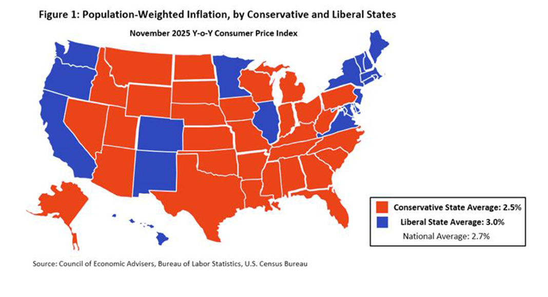 The same analysis found consistent differences based on political geography. It reported that “liberal states as well as cities inside liberal states have observed higher inflation rates in the past year than their conservative counterparts,” across “various measures of inflation, aggregation, and political categorization.”