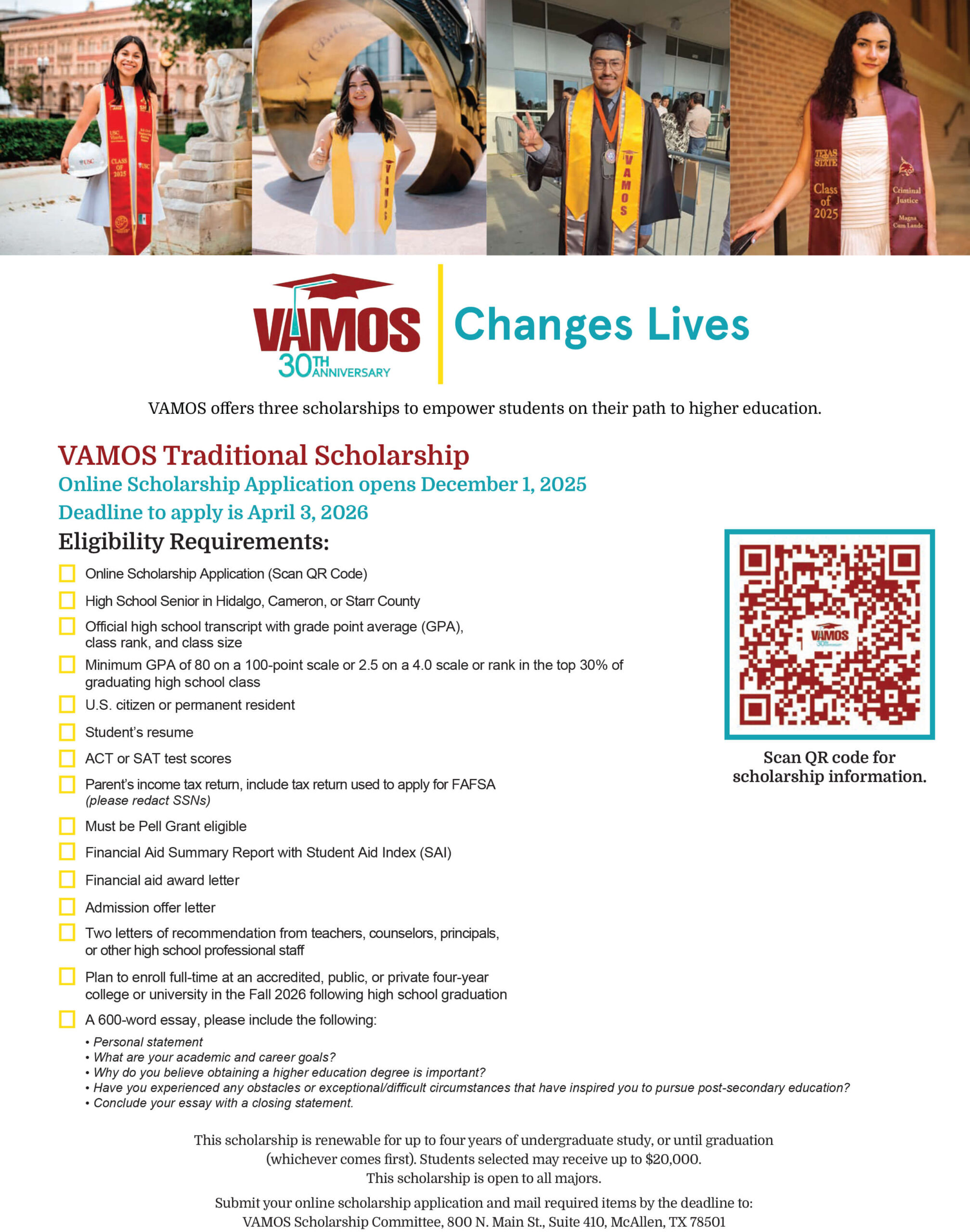 McALLEN, Texas – The Valley Alliance of Mentors for Opportunities and Scholarships (VAMOS) is pleased to announce that the 2026 VAMOS Scholarship Application officially opened on Monday, December 1. Graduating high school seniors from the Rio Grande Valley who plan to pursue a bachelor’s degree are encouraged to apply.