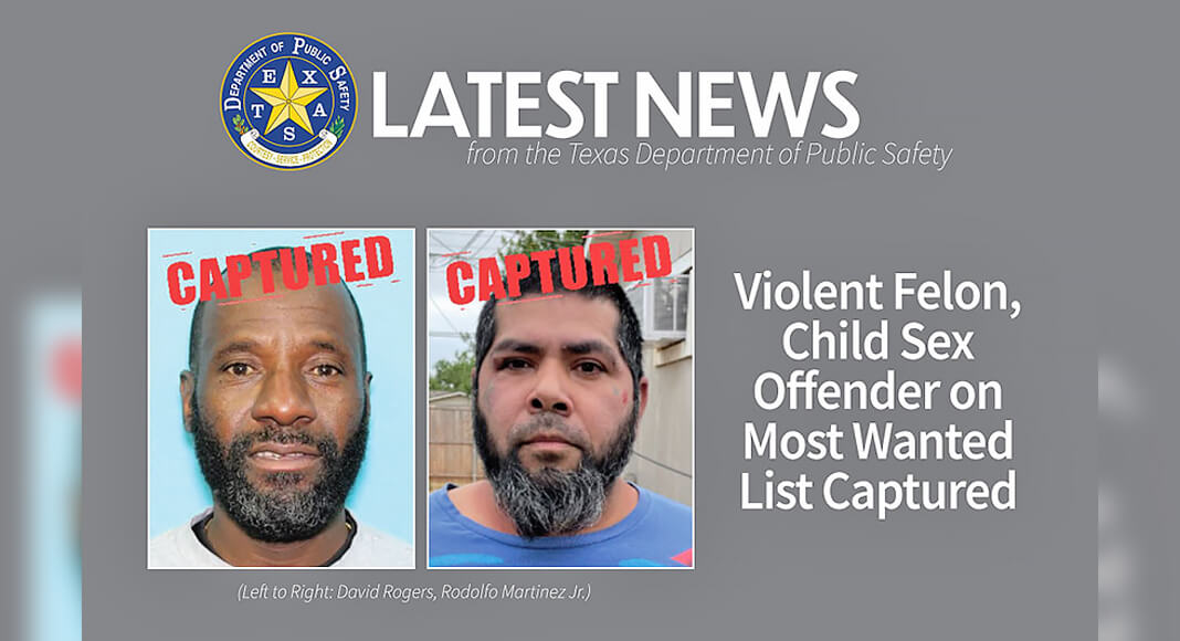 AUSTIN – Two of Texas’ 10 Most Wanted are back in custody following their arrests earlier this week. Authorities arrested 10 Most Wanted Fugitive David Rogers and 10 Most Wanted Sex Offender Rodolfo Martinez Jr. on April 28 and 29, respectively. A Crime Stoppers reward will not be paid in either case.
