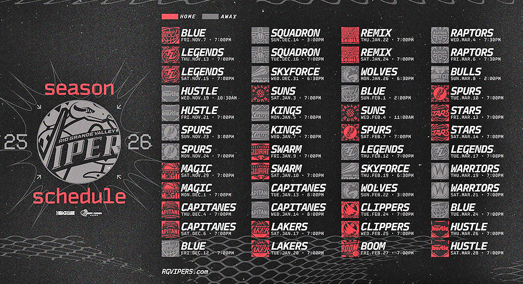 EDINBURG, Texas – The Rio Grande Valley Vipers, the NBA G League Affiliate of the Houston Rockets, announced today the Vipers schedule for the upcoming 2025-26 season. The schedule features a total of 50 games, which include 36 regular season games and 14 Tip-Off Tournament matchups.