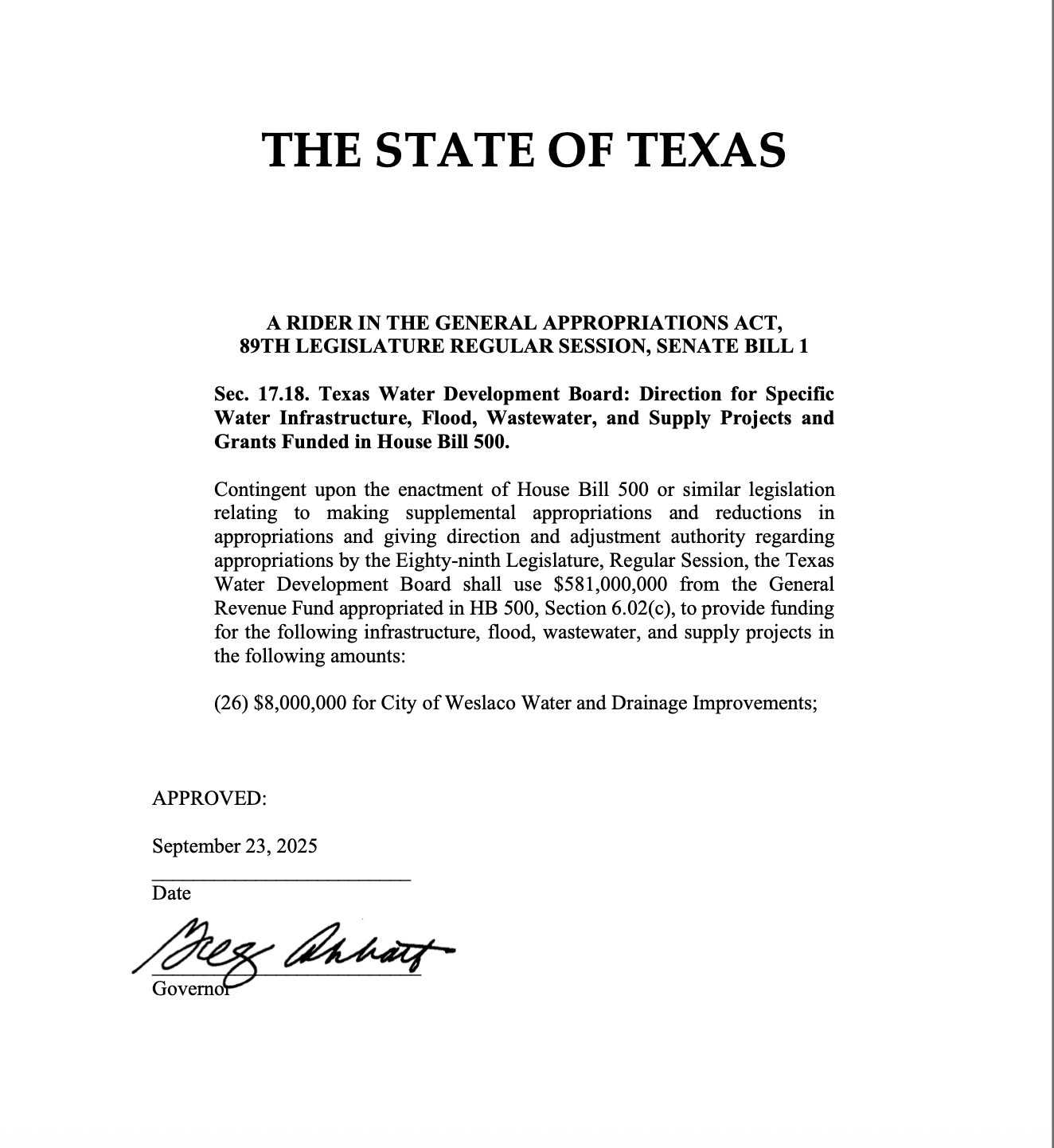 Mayor Adrian Gonzalez called the funding a regional victory. “This is a win, not just for the city of Weslaco, but for the region and for the Rio Grande Valley,” he said. “If we win, they win. And when they win, we win. This whole region wins.”