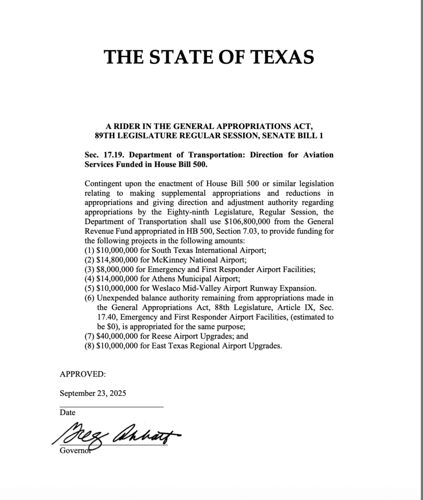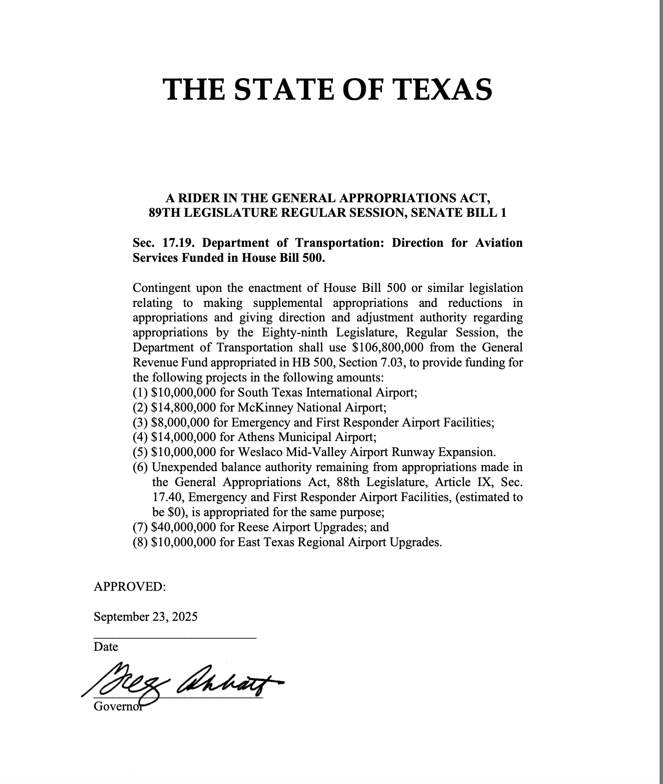 “The growing Rio Grande Valley needs an expanded Weslaco Mid-Valley Airport,” Abbott said. “Part of it is $10 million for a major runway extension at the airport that will allow larger aircraft to land here. Second, $8 million for the city of Weslaco for water and drainage improvements to accommodate the expanded airport. And third, emergency and first responder facilities—a critical component for this airport and for the entire region.”